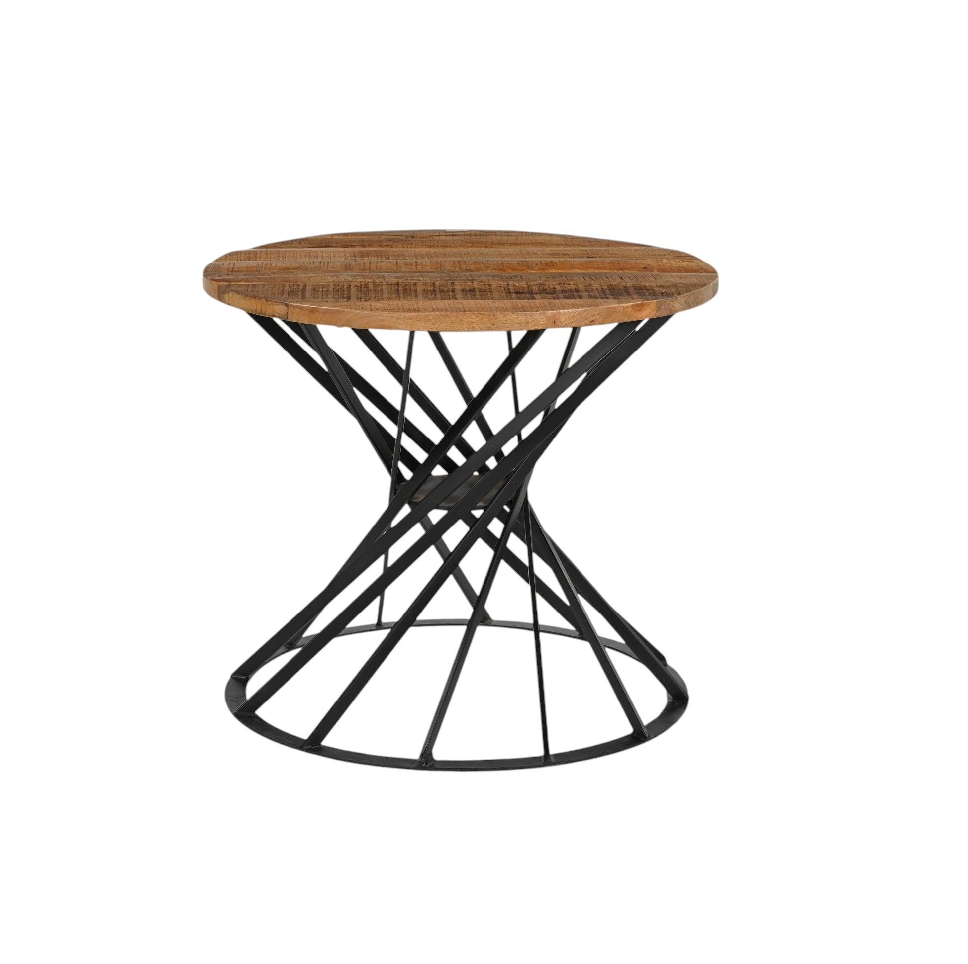 Make a bold design statement with this 33.5" round dining table, featuring a dynamic metal base and a richly grained solid wood top. The warm, natural finish of the wood contrasts beautifully with the sculptural, crisscrossing black iron base — creating a centerpiece that's both modern and industrial.
