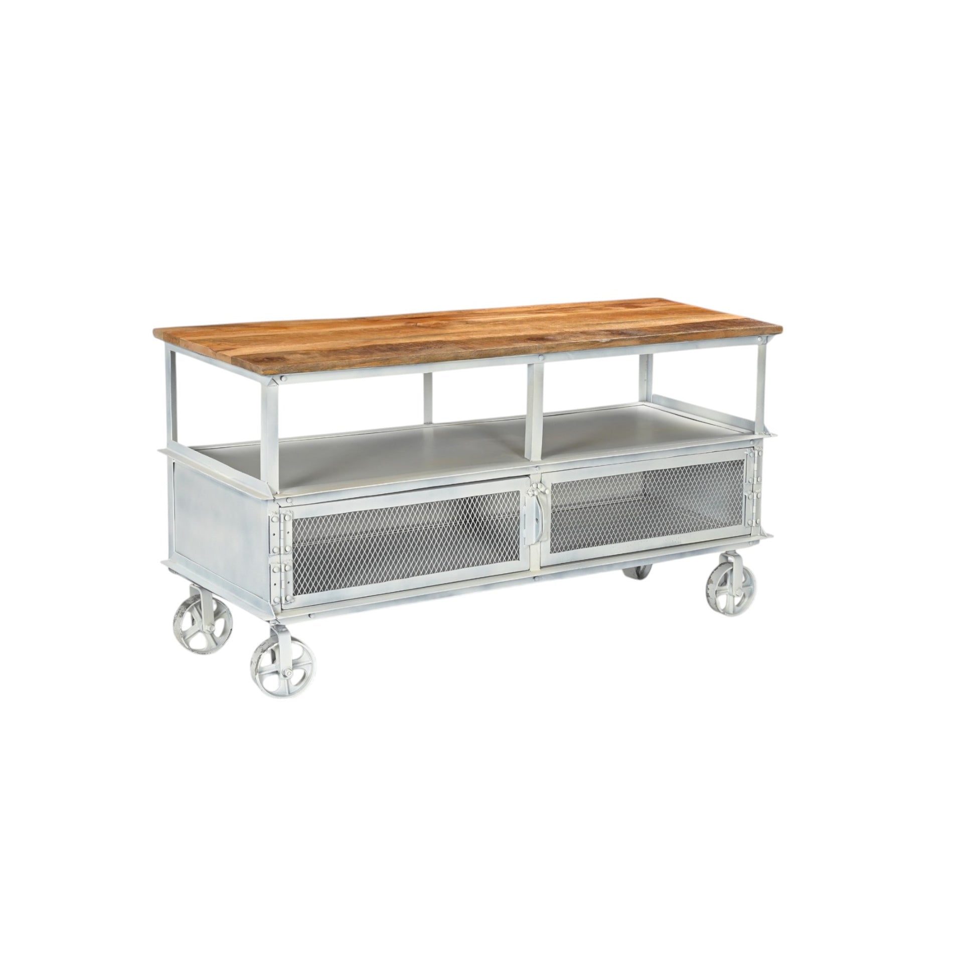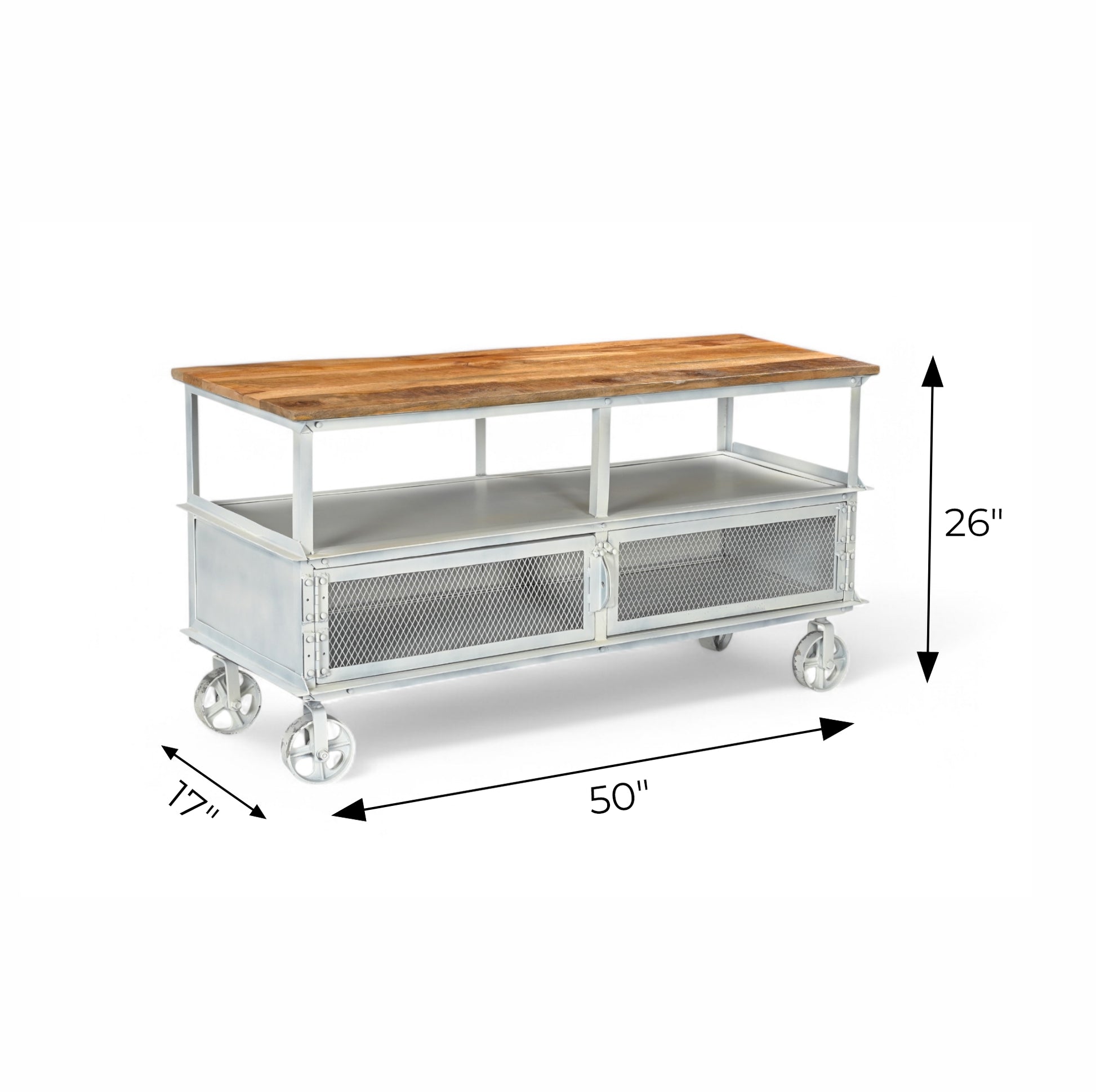 Bring industrial character to your living space with this rugged yet refined media console. Measuring 50” wide, 26” high, and 17” deep, it features a sturdy iron frame with a sleek silver finish and a natural mango wood top. The two mesh-front metal doors provide secure yet breathable storage for electronics, books, or media accessories, while the open shelf offers easy access to frequently used items. Four industrial-style caster wheels make it easy to move, making it perfect for versatile spaces like lofts, entertainment rooms, or modern offices. This console blends mobility, utility, and industrial style in one bold design