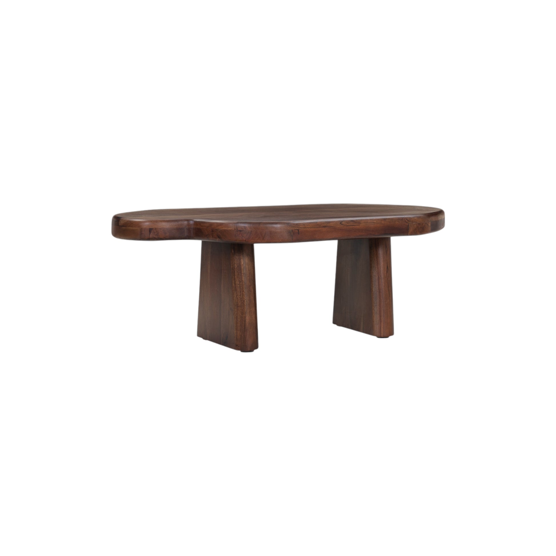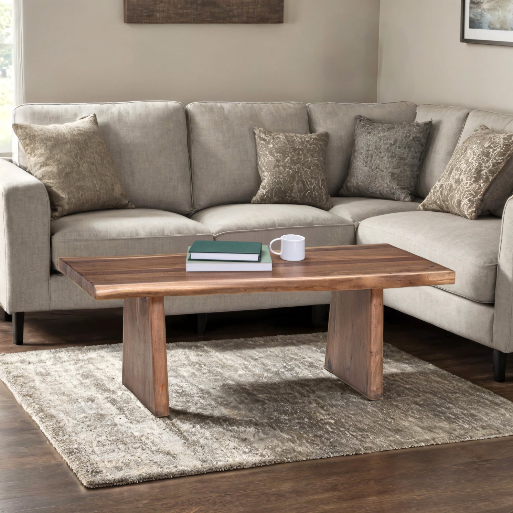 Elevate your living space with this striking solid wood coffee table, which can also be used as a versatile bench. Measuring 48" long, the design showcases a thick, natural-edge top that highlights the beautiful grain and organic character of the wood.