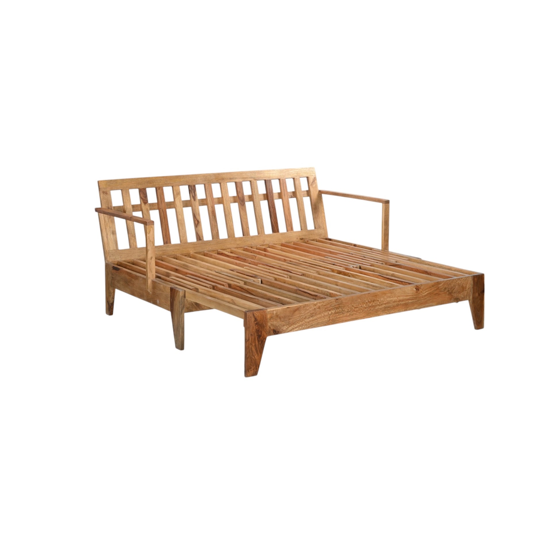 Bring relaxed elegance and natural warmth to your space with this versatile solid wood daybed frame. Expertly crafted from high-quality wood with a beautiful natural finish, this piece features a slatted backrest and armrests for an airy, open look. Its sturdy slatted base offers excellent mattress support, making it ideal for lounging during the day or accommodating overnight guests.