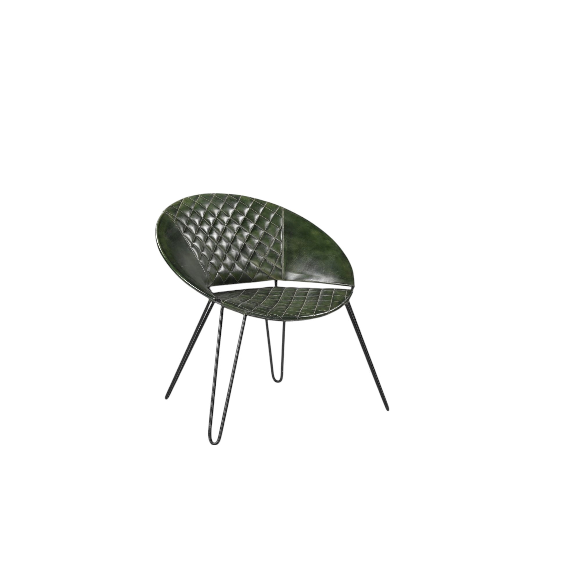 Add a bold touch of modern industrial style to your space with this distinctive accent chair. Featuring a sleek circular silhouette, the seat and backrest are upholstered in rich olive green leather with a quilted diamond pattern for added texture and comfort. The sturdy black metal legs provide reliable support while enhancing the minimalist design.