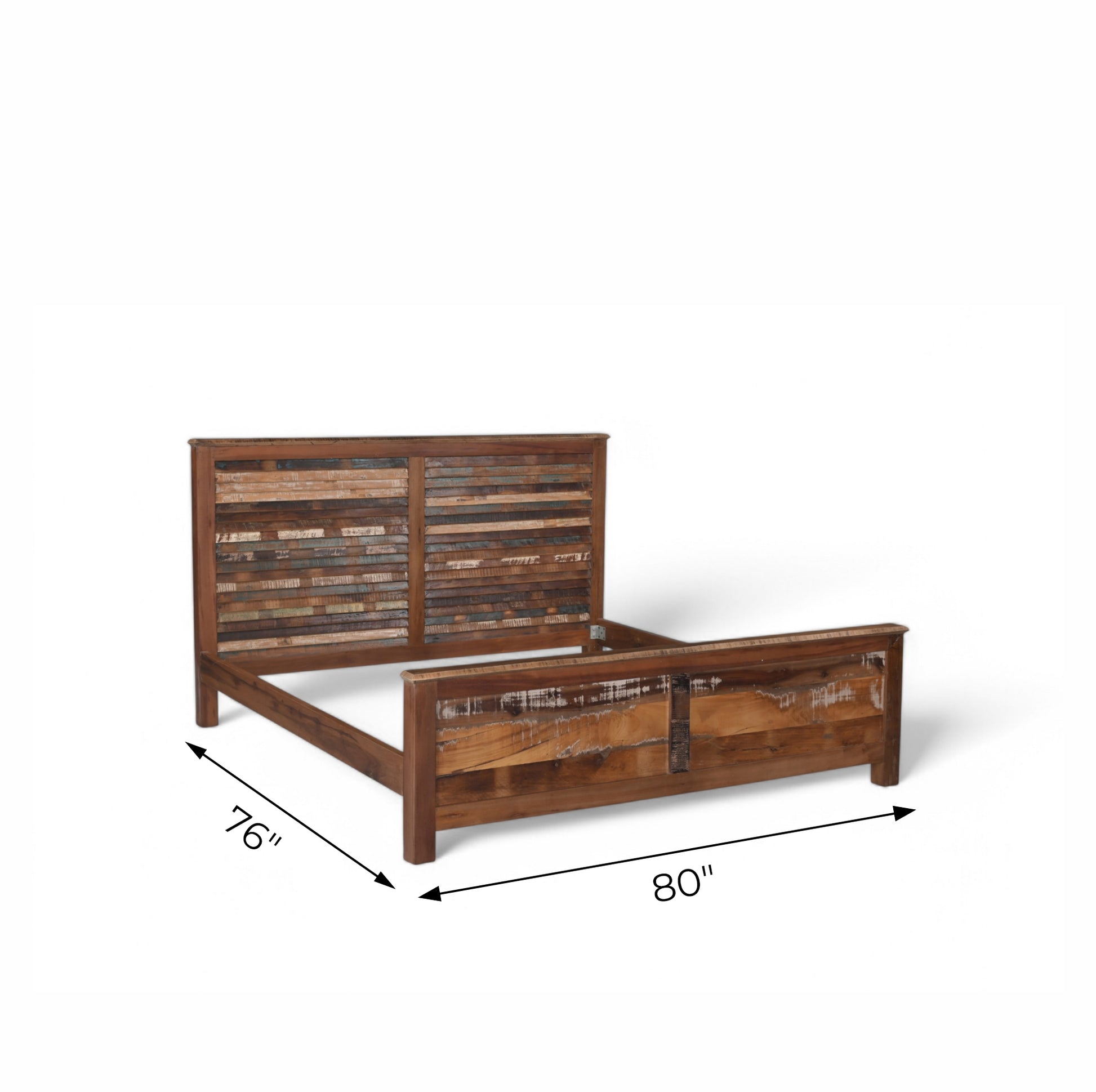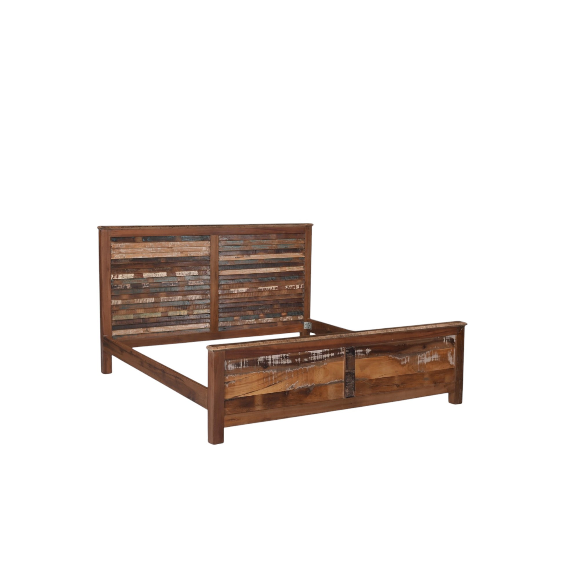 Crafted with character and charm, this handcrafted king-size bed frame showcases a beautifully rustic design. The headboard features a striking mosaic of reclaimed wood slats in various natural finishes, bringing warmth and texture to any bedroom. The footboard carries a distressed, weathered look with bold horizontal panels and subtle iron accents, giving it a vintage-industrial flair.